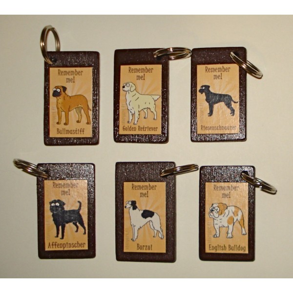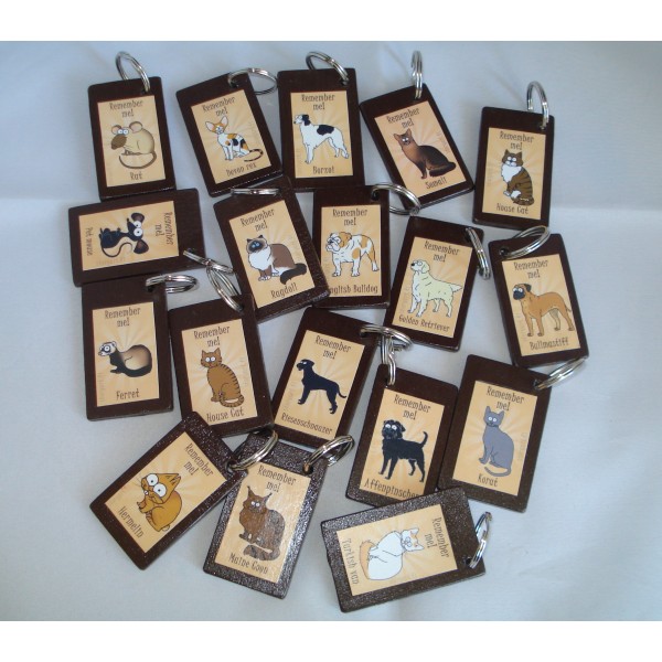 Puinen avaimenperä sarjakuvamaisella eläinkuvalla. Useita erilaisia eläinaiheita. Vaihtoehdot lueteltu alla. Tekstit: Ylhäällä "Remember me!" ja alhaalla eläimen rodun englanninkielinen nimi. Väri: tummanruskea. Materiaali: maalattu ja lakattu vaneri painokuvalla. Sisältää pienen avainrenkaan. Koko: noin 5 cm x 3 cm x 3,5 mm. Kiva pikku lahja ystävälle tai vaikkapa itselle. Auttaa pitämään tärkeät avaimet tallessa. Valmistaja: Story Art / Satu Anttila