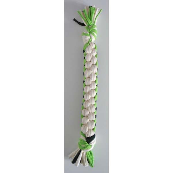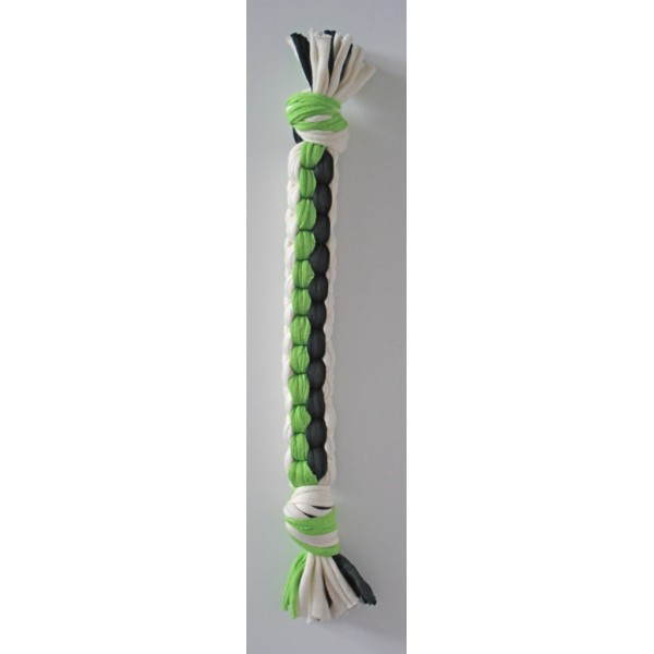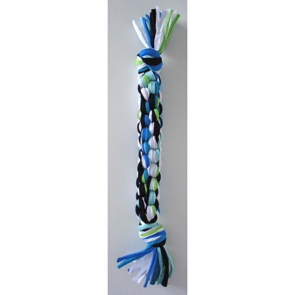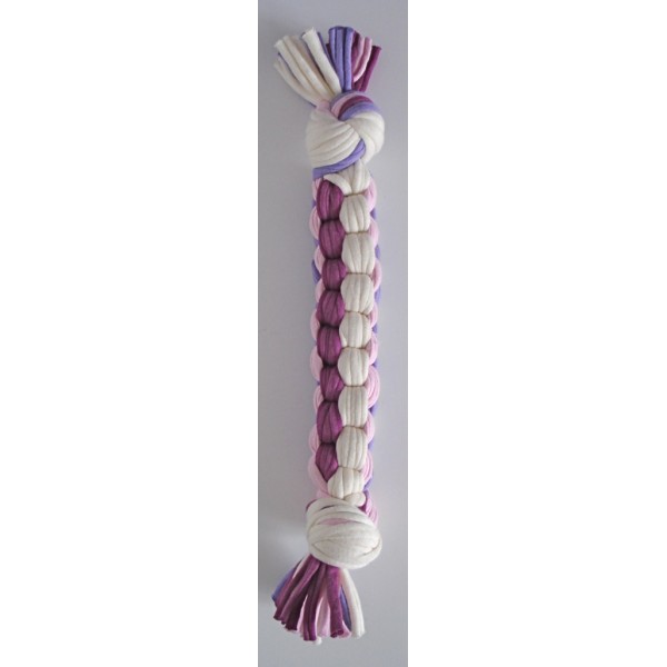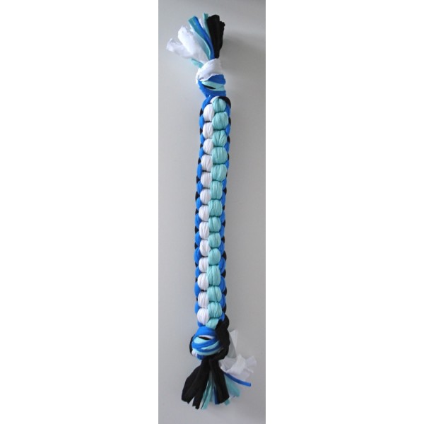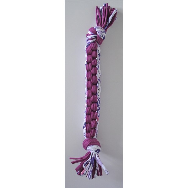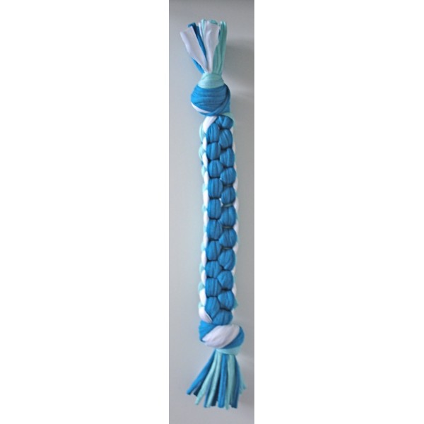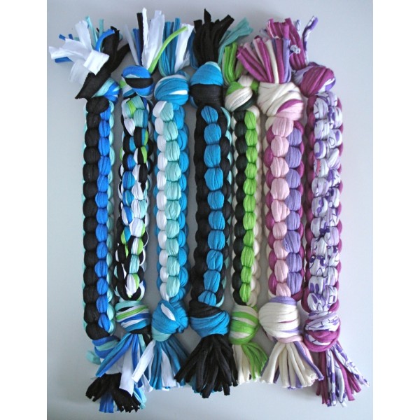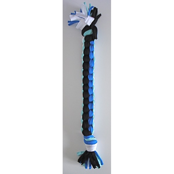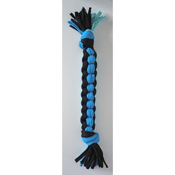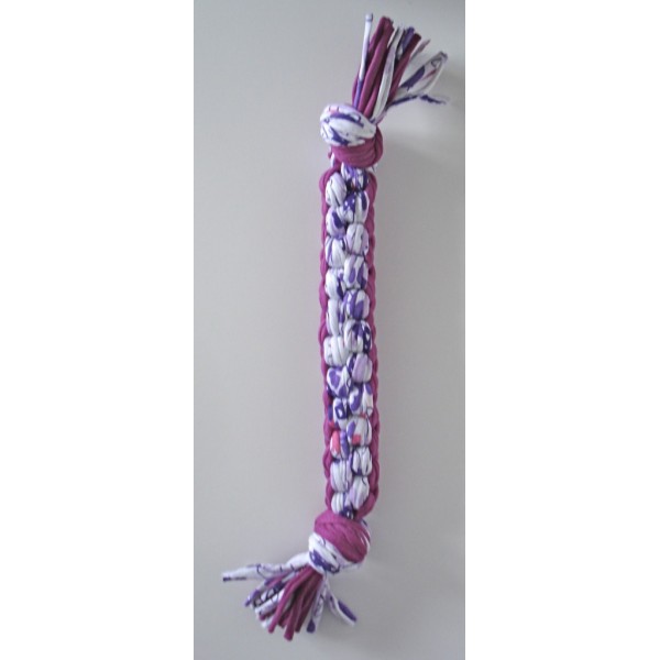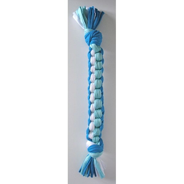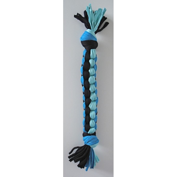 Punottu heittolelu koiralle aktivointi- ja noutoleikkeihin. Päädyissä solmut ja hapsuja. Useita iloisen värikkäitä vaihtoehtoja. Osaa koristavat raidat, osa on kirjavia. Tilauksesta saatavilla myös omilla suosikkiväreilläsi. Valitse tällöin valikosta vaihtoehto "Toiveväri" ja ilmoita tilatessasi 1-4 toiveväriä, jos haluat raidallisen lelun tai 3-6 toiveväriä, jos haluat kirjavan lelun. Kestävä ja turvallinen, sillä ei sisällä irtoavia osia. Materiaali: hieman joustava trikookude. Kokonaispituus noin 40 cm, paksuus noin 3,5 cm. Lelu on muodoltaan kulmikas. Ei säikähdä likaantumista ja voidaankin tarvittaessa pestä pesukoneessa tai käsin 40 asteessa. Kiva lahjaidea eläinystävälle. Valmistaja: Lilinella