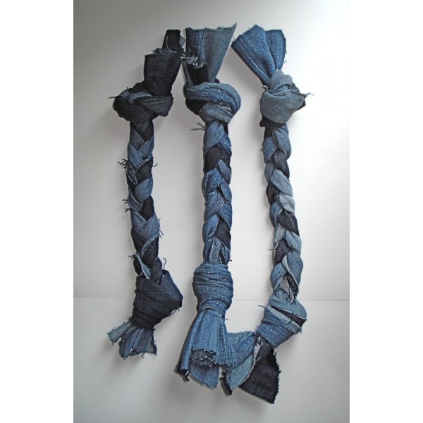 Kiva kierrätyskankaasta valmistettu letitetty lelu koiralle. Päädyissä solmut. Eri sävyjä. Koko: pituus noin 38 cm, letin leveys noin 3 cm. Materiaali: kestävä denim-kangas. Sopii hyvin esim. heitto- tai vetoleluksi. Turvallinen, sillä ei sisällä irtoavia osia. Voidaan pestä 40 asteessa. Tekijä: Lilinella