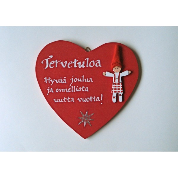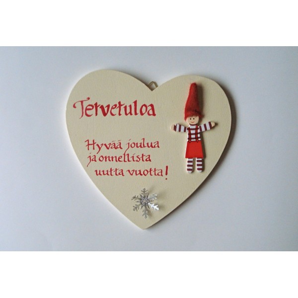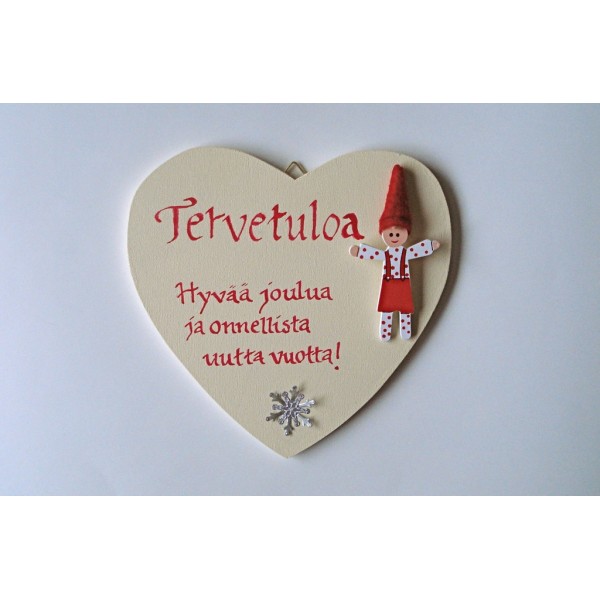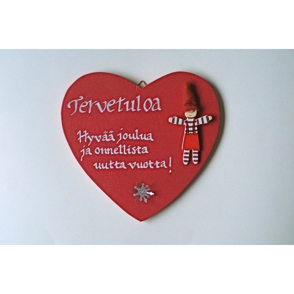 Kaunis käsinkoristeltu sydämen muotoinen ja jouluaiheinen ovikyltti. Koristeltu käsin tekstaamalla. Mukana tonttufiguuri. Pinta lakattu. Värit: joulunpunainen tai luonnonvalkoinen. Materiaali: vaneri, messinki ja luonnonnaru. Koko: 16 cm x 13,9 cm x 0,6 cm. Jokainen taulu on uniikki. Helppo ripustaa seinälle. Sisältää ripustusnarun sekä kaksi ripustuskoukkua. Kiva idea lahjaksi ystävälle. Valmistaja: Lilinella