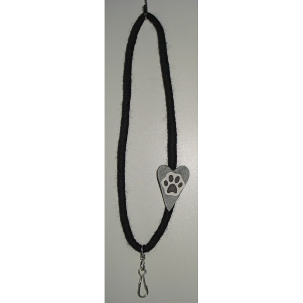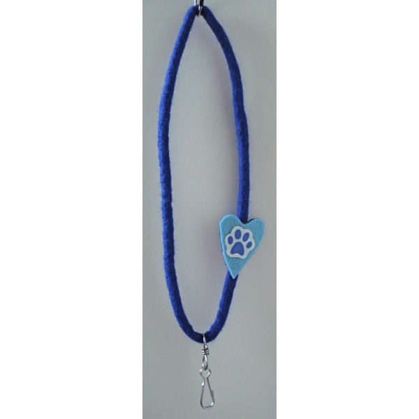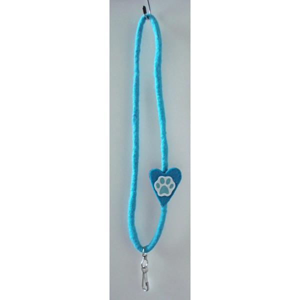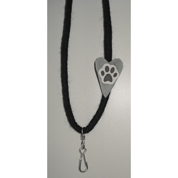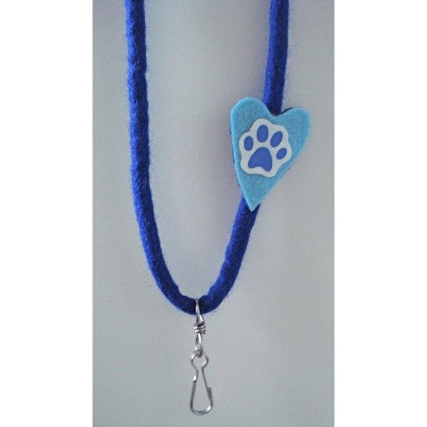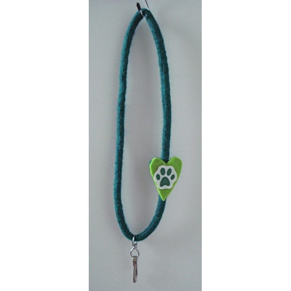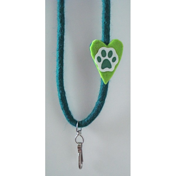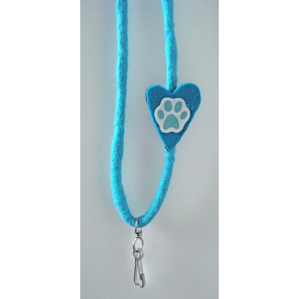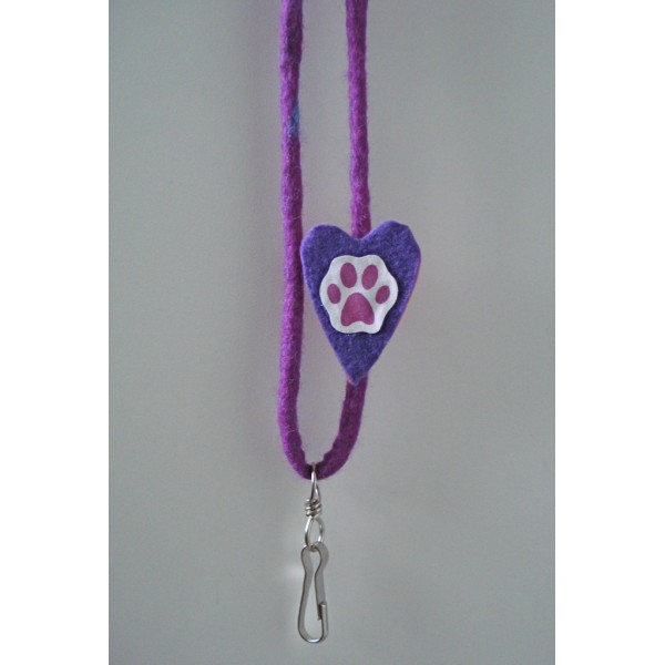 Kaunis huovutettu avainnauha sydänkoristeella ja tassukuvalla. Sopii hyvin nauhaksi avaimille, työpaikan henkilökortille tai kulkukortille ja lemmikkinäyttelyssä numerolapun pidikkeeksi. Materiaali: lampaanvilla, huopakangas, puuvillakangas ja niklattu karabiinilukko. Sydänkoristeessa on päällekkäin tummaa ja vaaleaa huopakangasta. Tassun väri mukailee nauhan väriä. Nauhan pituus noin 65 cm. Useita eri värejä. Jokainen avainnauha on yksilöllinen. Tekijä: Lilinella