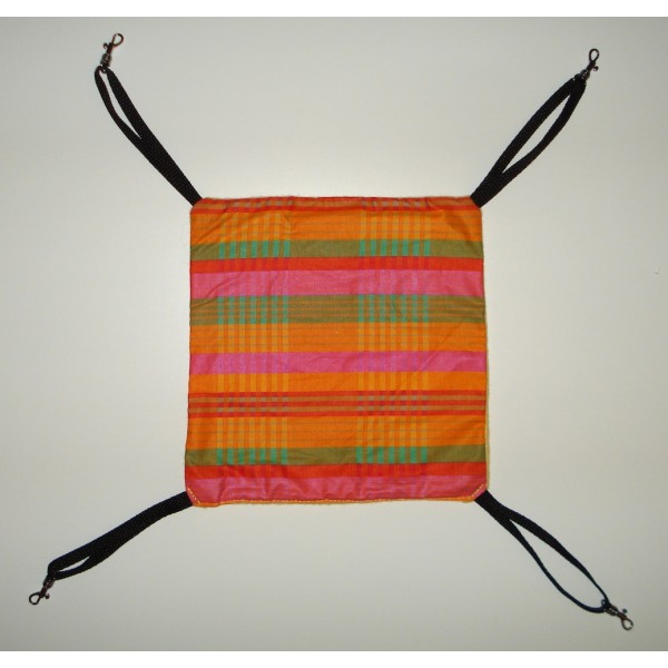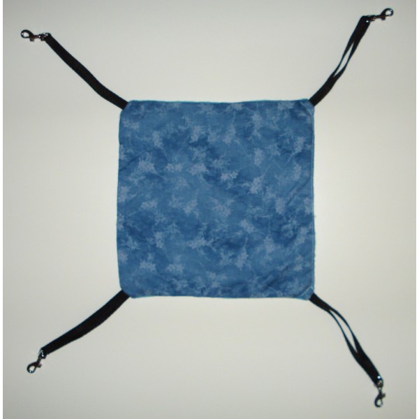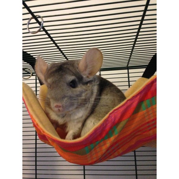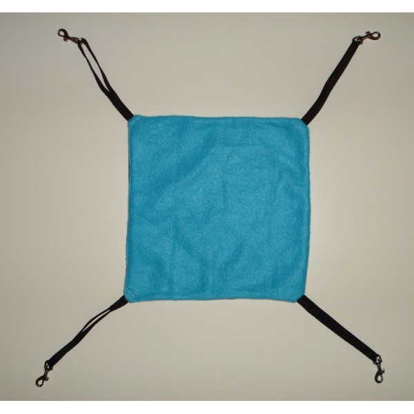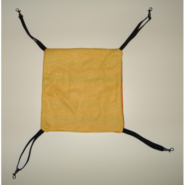 Kiva ja suloinen riippari jyrsijälle. Sopii hyvin esimerkiksi rotille, chinchilloille, freteille ja deguille uni- tai leikkipaikaksi. Helppo kiinnittää jyrsijän häkin yläreunaan karabiinilukkojen avulla. Vaihtamalla kiinnikkeiden paikkaa riipparin mallia ja korkeutta pystyy vaihtelemaan. Kaksivärinen, kääntöpuolilla eri väristä kangasta. Saatavilla eri värejä. Koko: noin 23 cm x 23 cm, kiinnikkeiden pituus lukon kanssa noin 15,5 cm. Materiaali: Kangas fleeceä, kääntöpuoli puuvillaa, musta nylonnauha ja karabiinilukko. Tekijä: Cinnamon