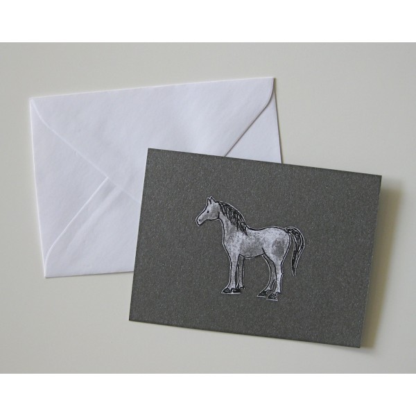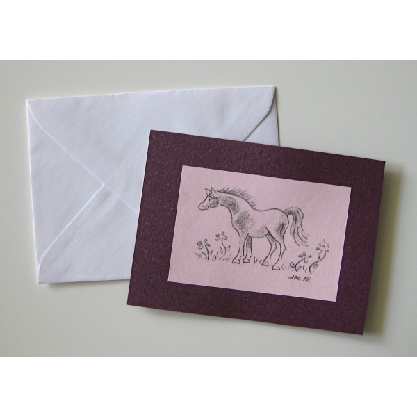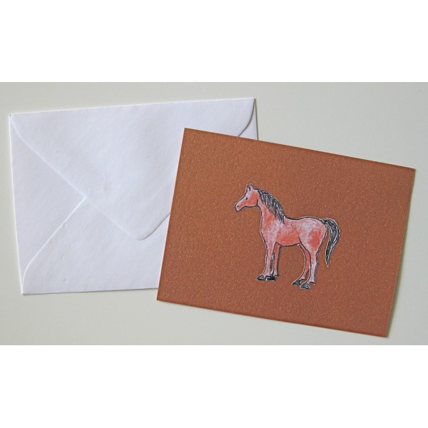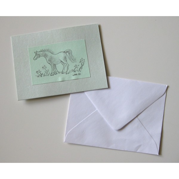 Hauska ja pieni hevosaiheinen kortti. Useita kauniita helmiäissävyjä. Kaksi eri kuva-aihetta. Koko: 10,4 cm x 7,6 cm. Kortti on yksipuoleinen, kääntöpuolella tilaa kirjoittaa onnittelu tai muu henkilökohtainen viesti. Sisältää pienen valkoisen kirjekuoren. Tekijä: Pollen Piirto / Jenni Äijälä