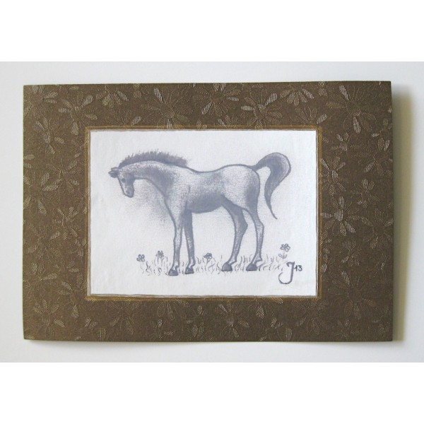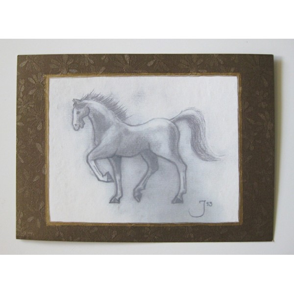 Kaunis hevosaiheinen kortti. Kaksi eri kuva-aihetta. Kortin tausta kauniin kultasävyinen. Kuva piirretty käsin ja kopioitu. Koko A5. Kortti on yksipuoleinen, kääntöpuolella tilaa kirjoittaa onnittelu tai muu henkilökohtainen viesti. Tekijä: Pollen Piirto / Jenni Äijälä