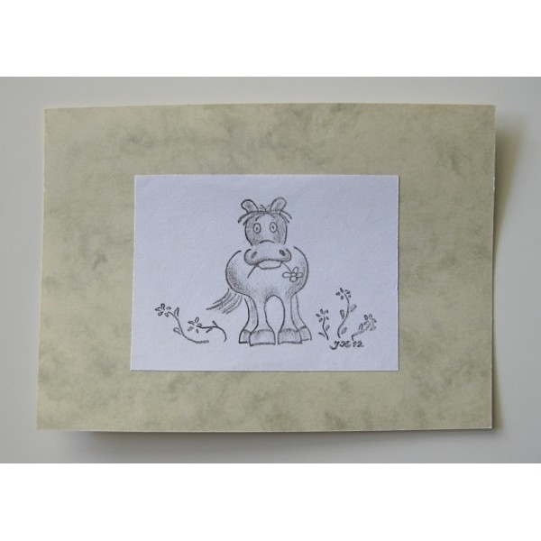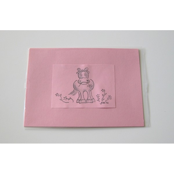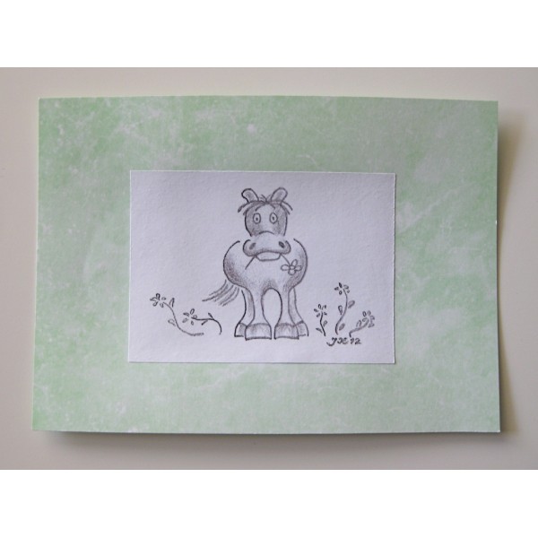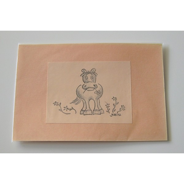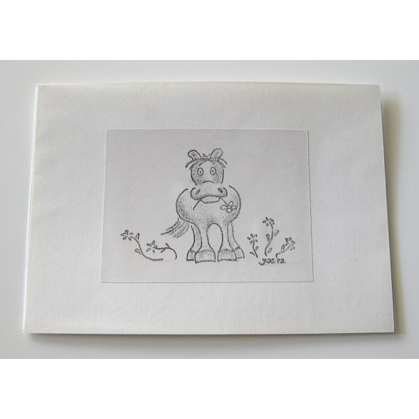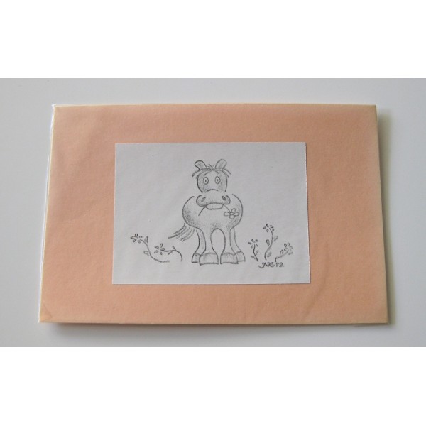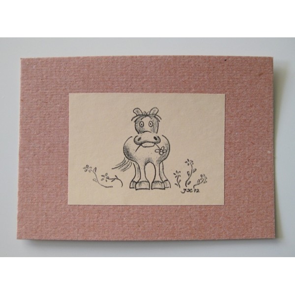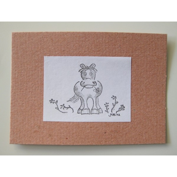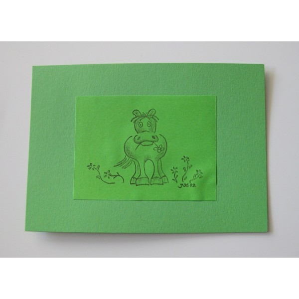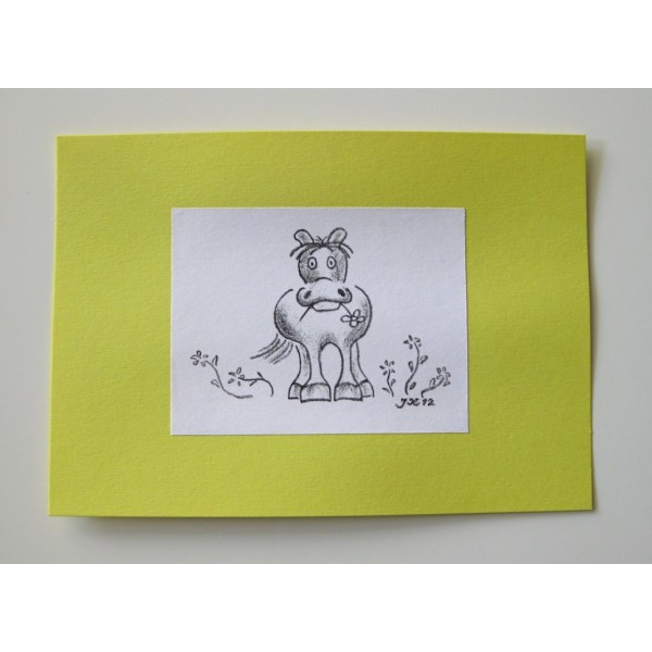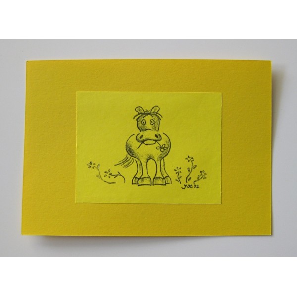 Hauska hevosaiheinen kortti. Useita erilaisia sävyjä. Kaikissa sama iloinen kuva-aihe. Koko A6. Kuva on käsin piirretty ja kopioitu. Kortti on yksipuoleinen, kääntöpuolella tilaa kirjoittaa onnittelu tai muu henkilökohtainen viesti. Tekijä: Pollen Piirto / Jenni Äijälä