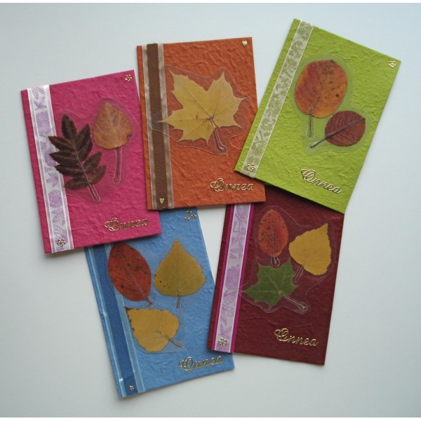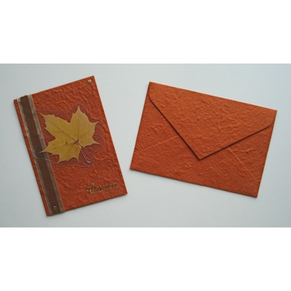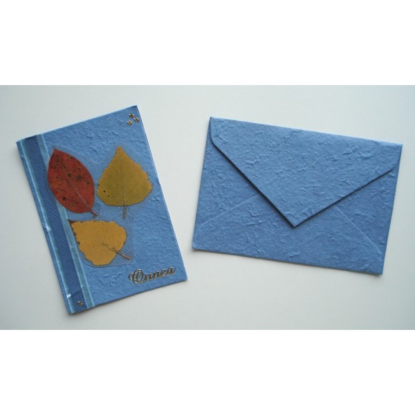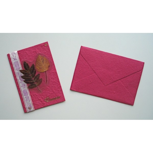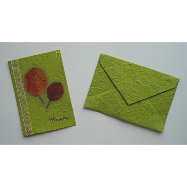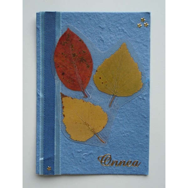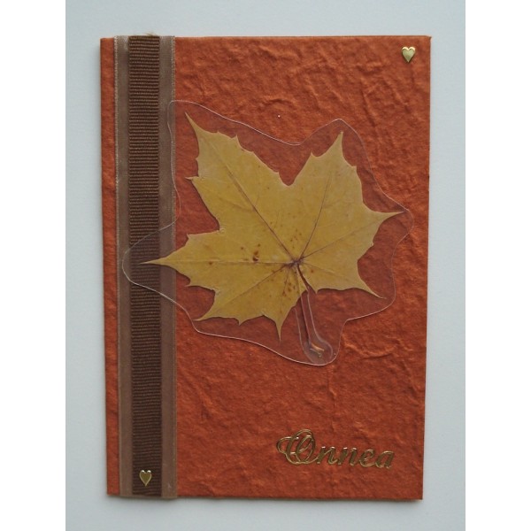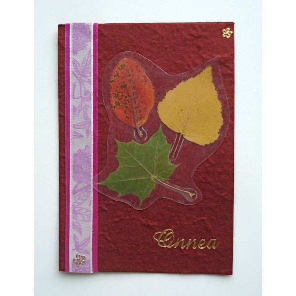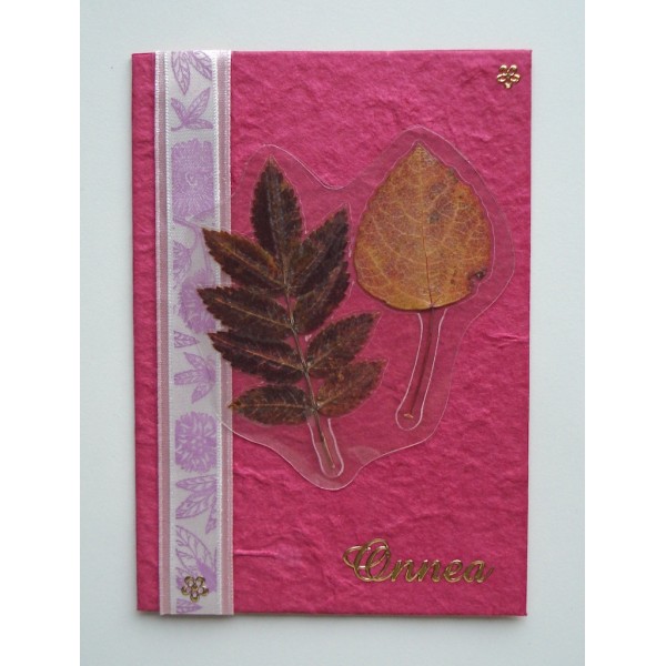 Kaunis käsintehty onnittelukortti. Koristeena kuivattuja syksyn lehtiä ja koristenauhaa. Korttipohja on kaunista ja eläväisellä pinnalla varustettua mulperipaperia. Settiin sisältyy kirjekuori. Saatavilla useita kauniita värejä. Tällä kortilla kelpaa lähettää syysonnitteluja ystäville. Valmistaja: Lilinella