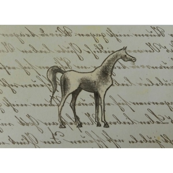 Kaunis ja pieni vintagetyylinen hevoskortti. Kuva käsin piirretty ja kopioitu. Taustalla kaunis käsialakuvio. Kortin koko: 10,6 cm x 7,4 cm. Kortti on yksiosainen, kääntöpuolella tilaa kirjoittaa onnittelu tai muu henkilökohtainen viesti. Taustakuvion pienet vaaleat "tahrat" eivät ole likaa, vaan kuuluvat korttipohjan vintagekuviointiin. Tekijä: Pollen Piirto / Jenni Äijälä