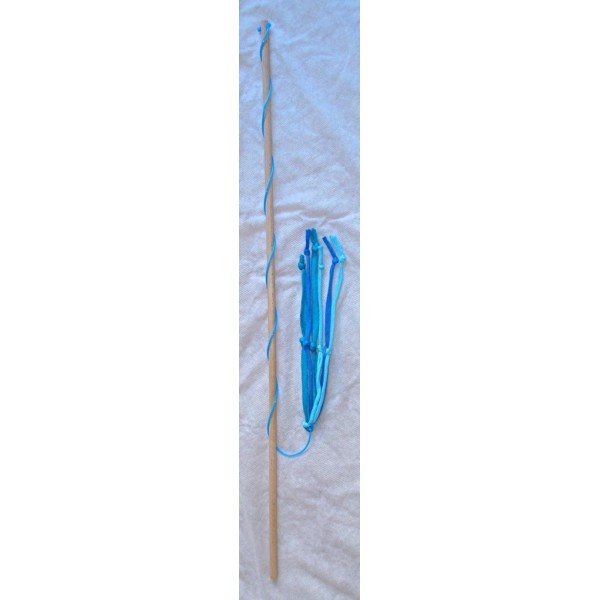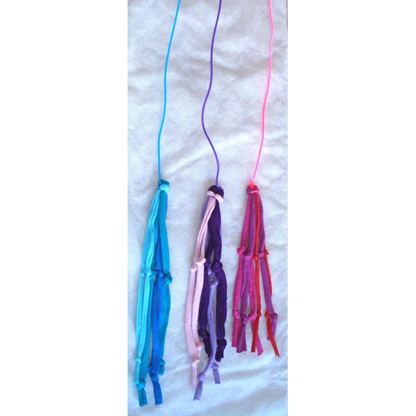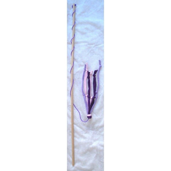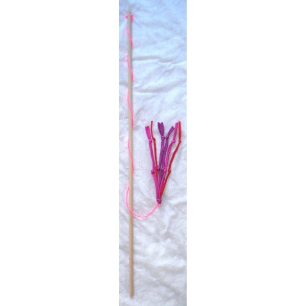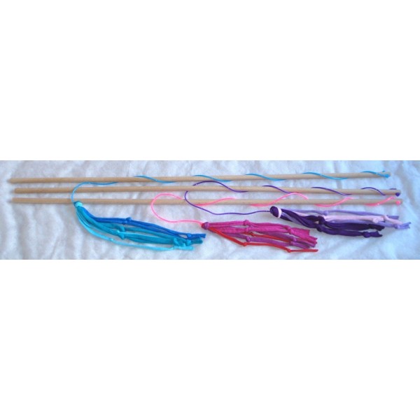 Kissan huiska, jossa hapsuja ja solmuja. Materiaali: hieman venyvä trikookude, muovinaru ja vaalea puu. Narun pituus noin 60-70 cm, puuvarren pituus 60 cm ja hapsuosan pituus noin 20 cm. Eri värejä. Turvallinen, sillä ei sisällä irtoavia osia. Tällä huiskalelulla on hauska aktivoida kissaa. Valmistaja: Lilinella