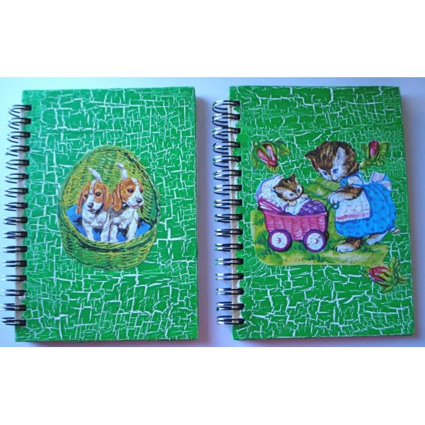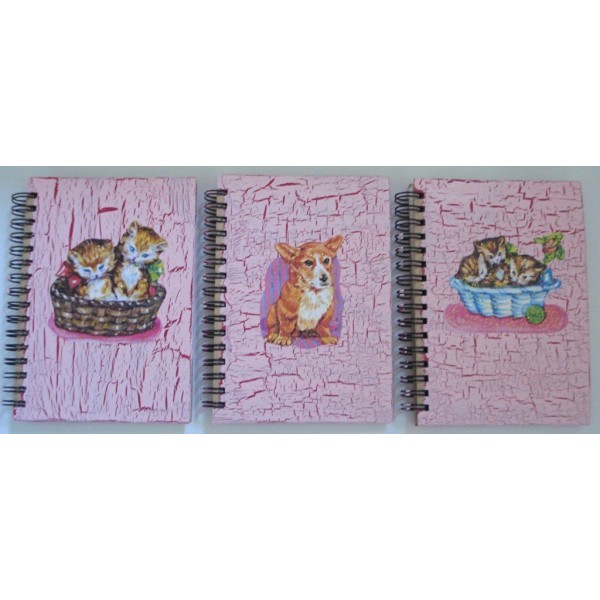 Kierrevihko eläinkuvalla. Kiva pikkuvihko muistiinpanojen tekemistä varten. Koko A6. Sivut viivoitettuja. Kannet koristeltu krakleeraamalla. Etukannessa eläinaiheinen kiiltokuva ja koristeena kimaltelevaa hilettä. Eri eläinaiheita ja värivaihtoehtoja. Jokainen vihko on yksilöllinen. Ilmoita tilatessasi minkä vihkon haluat. Vaihtoehdot listattu alla. Kiva lahjaidea ystävälle tai vaikkapa itselle. Valmistaja: Lilinella