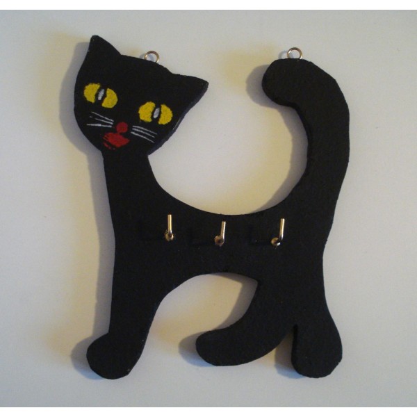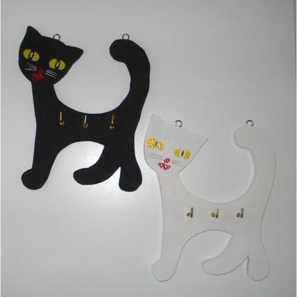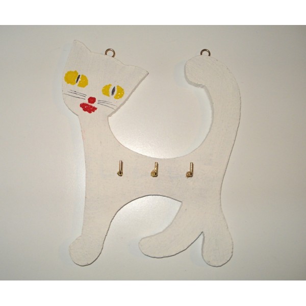 Käsintehty naulakko hauskalla kissa-aiheella. Naulakkoon on helppo ripustaa esim. avaimet, patalaput, pyyhkeet ja vaatteet. Sopii hyvin keittiöön, eteiseen, lastenhuoneeseen tai mihin vain, missä naulakolle on tarvetta. Kiva idea vaikkapa lahjaksi eläinystävälle. Värit: musta ja valkoinen. Materiaali: vaalea lastulevy. Koko: noin 20 cm x 16 cm. Sisältää seinäkiinnikkeet. Tekijä: Pete-Peikko / Petri Pirttilä